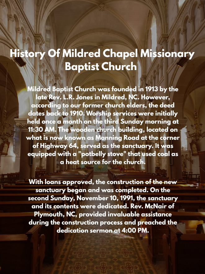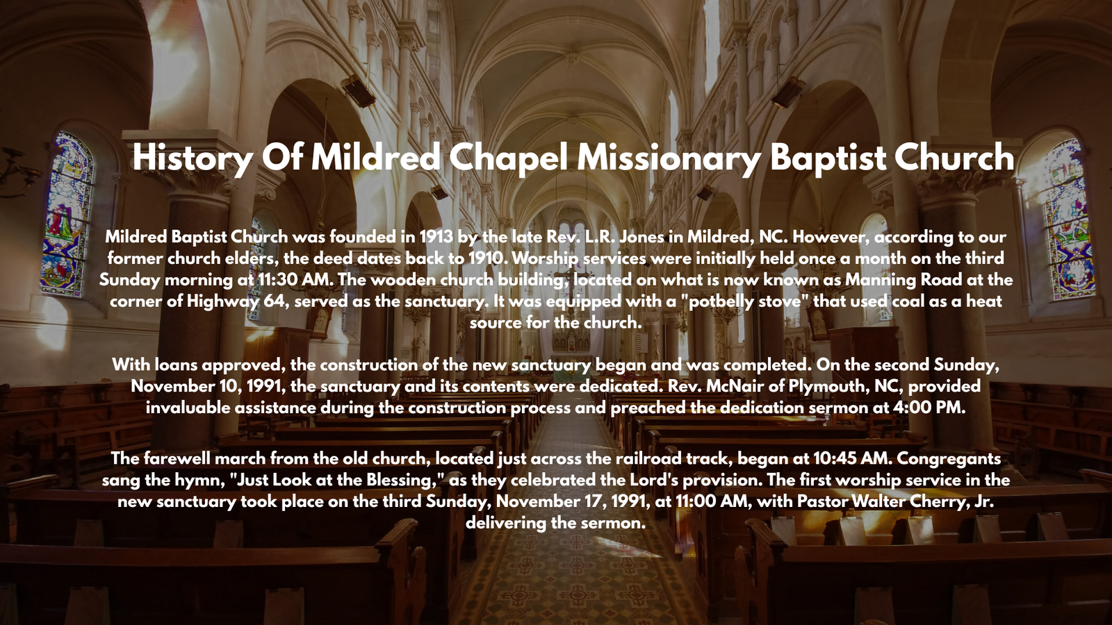 Mildred Baptist Church was founded in 1893 by the late Reverend L.R. Jones. Following Reverend Jones, ten ministers served as leaders of the church: